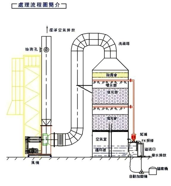 采用洗涤塔设备处理,技术成熟,运行稳定,处理效果好的工艺方法.该方法可对多种气体成分进行多级连续处理,它的适应性广泛.该工艺适用于处理大气量,高浓度的酸碱气体.它的特点是最大限度增加气液相接触,增进气液相传质速率,达到高效处理的目的.在化学洗涤吸收工艺中,可根据气体浓度和成分的变化,改变药剂的浓度和投加量,降低运行费用,提高处理率.