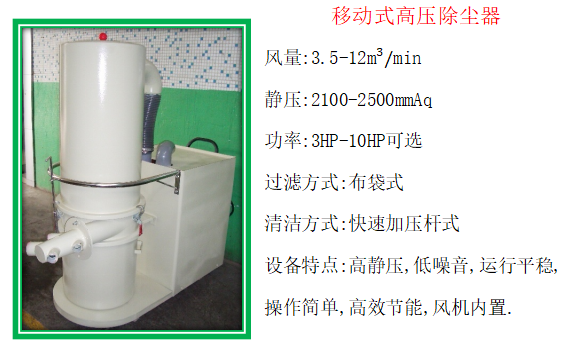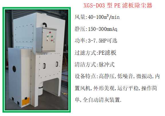该设备对比重较大的金属切削,铸造用砂,如车磨床,碳粉,颜料,胶木粉,塑料粉等,以及比重较大的非纤维性粉尘均有良好的除尘效果.